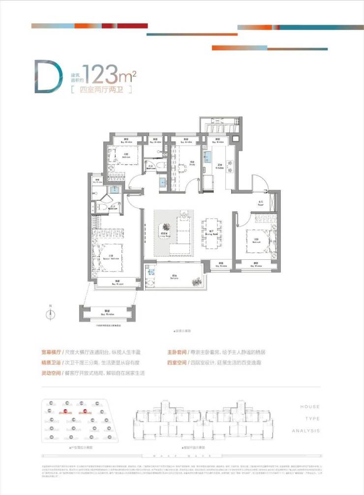 建面约123㎡4房四开间朝南搭配一个巨幕横厅,让室内尺度与采光都达到了极致。