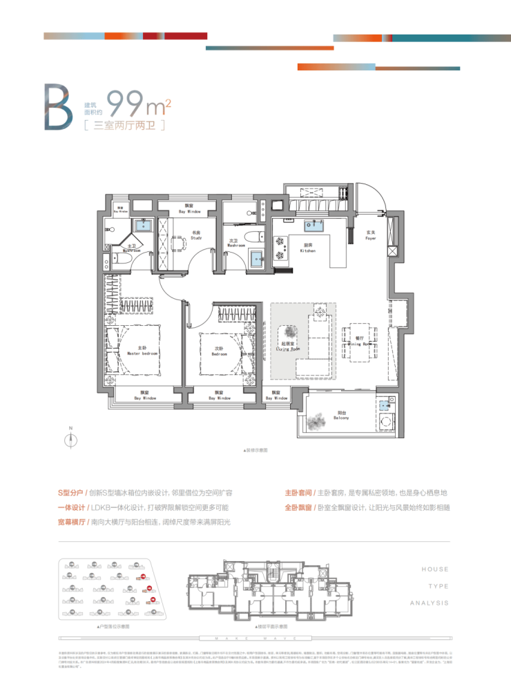 建面约99㎡B户型客餐厅配置超大尺度横厅,全卧室飘窗就连主卫也配置了一个飘窗;