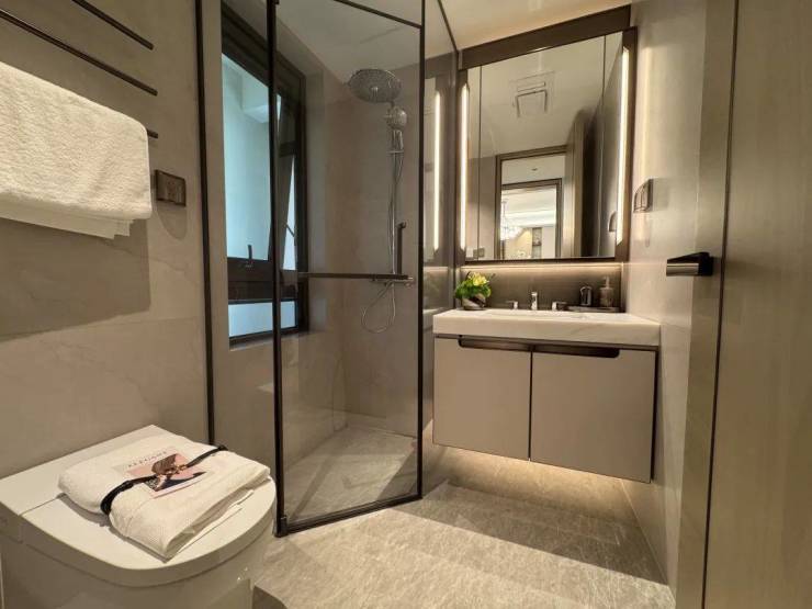 主卧独立套房,带全明卫生间,主卧床头软包也是交付的。卫生间除了高仪、杜拉维特等品牌外,淋浴屏是国产高端品牌玫瑰岛,细节上增设了电热毛巾架,大户型的主卫还有卡德维浴缸。