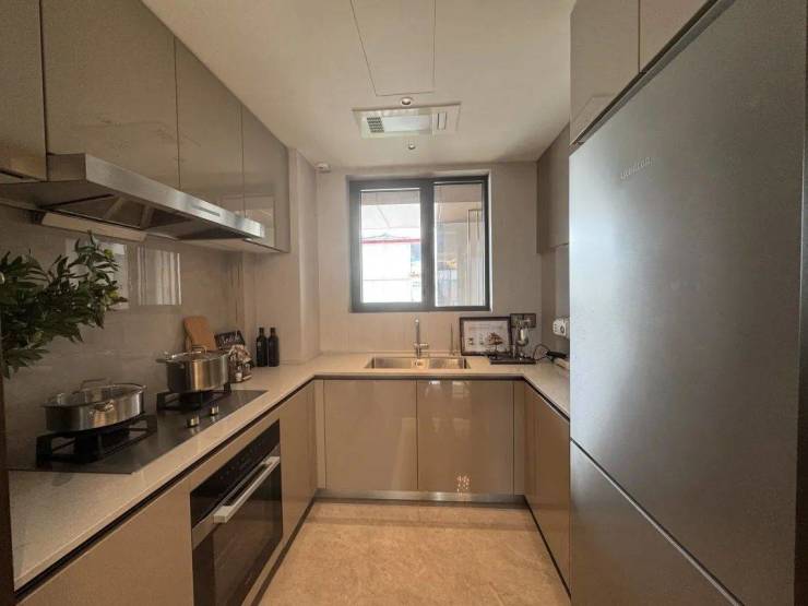 厨房配置美诺四件套(两眼灶+油烟机+洗碗机+蒸烤一体机),进口利勃海尔冰箱,橱柜门板采用的也是豪宅御用的威乃达,配置末端净水、凉霸;约169㎡大户型在此基础上升级了中西双厨带岛台,美诺三眼灶,标准双开门冰箱,净水升级成为软水。