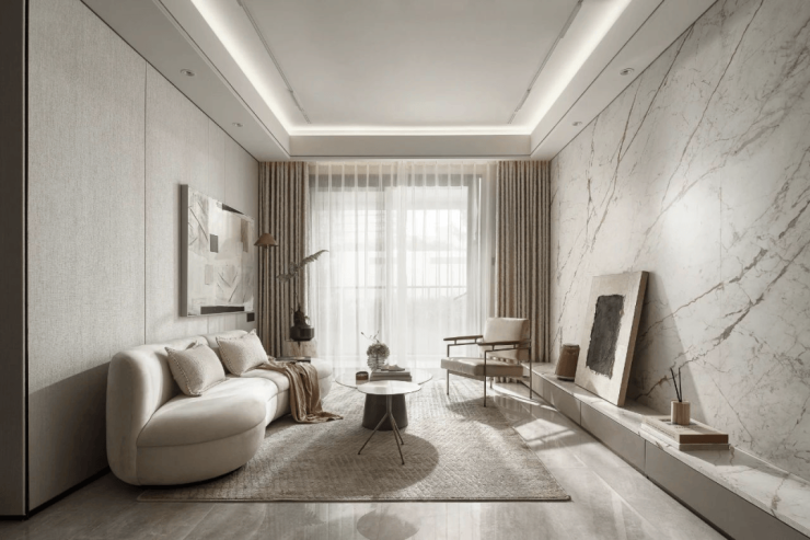 而在硬性标准之上,保利·海上瑧悦还充分融合了东方文化高定细节!比如说,客厅整面交付的大面积岩板背景墙均为东方定制款式,采用的是水墨丹青和徽州印象样式,配色风格凸显东方风雅;