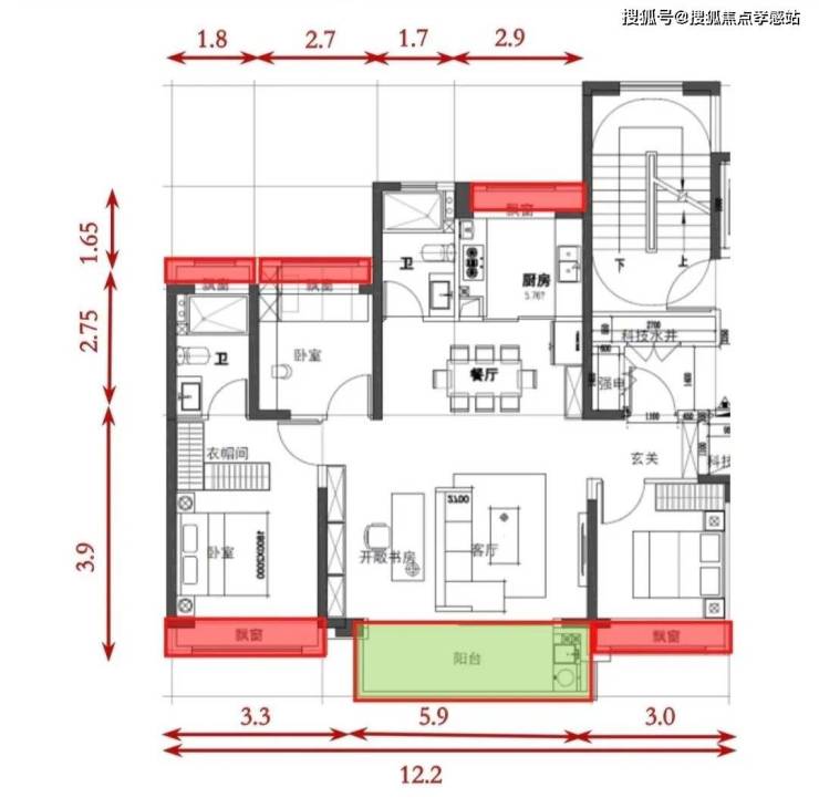 江湾金茂府售楼部热线:400-8080-420☎√建筑面积约110㎡户型的阳台将次卧和客厅联通,南北采光面都很大;建筑面积约123㎡三房两厅两卫