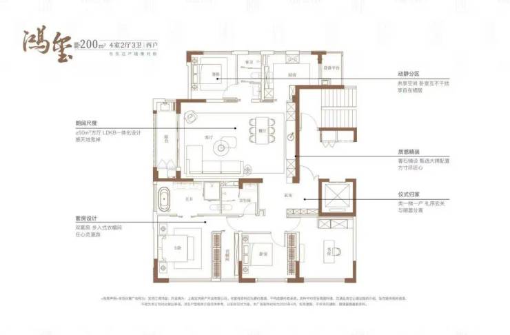 建面约200㎡4房2厅3卫户型,做到了三开间朝南+主卧豪华套房设计+南北通透,保证每个家庭成员都能有自己独立的居住空间,私密性拉满。