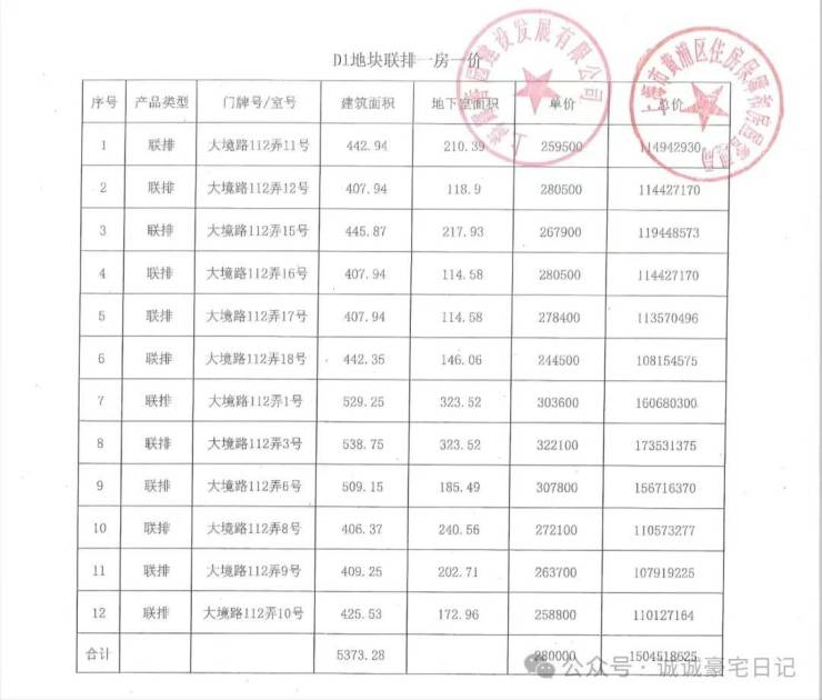 【一房一价表】