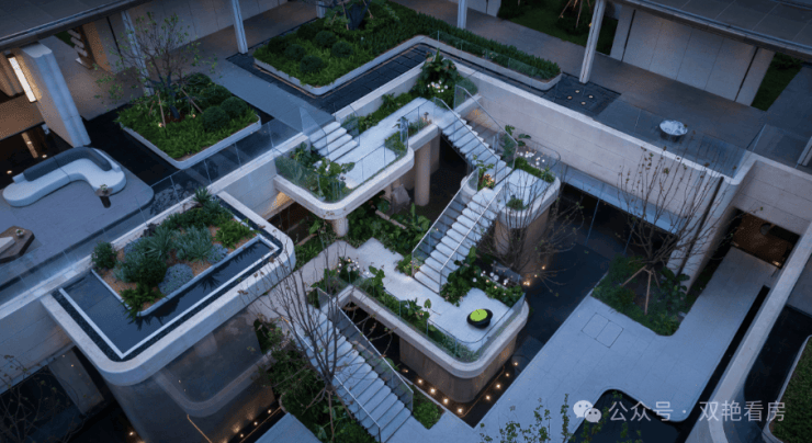 四层悬浮岛屿式阶梯,借鉴全球十二大奢华酒店之一的迪拜丽晶公寓,每一个观景露台都种植着不同的植被,一步一景。