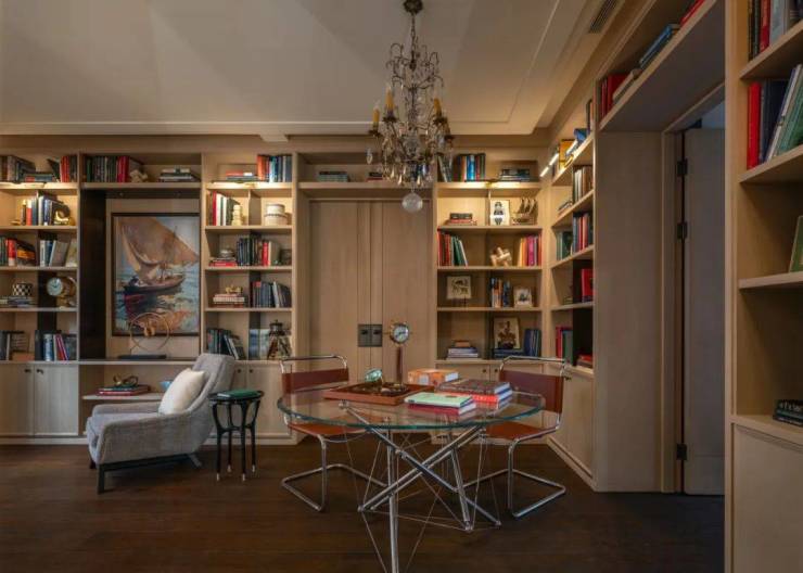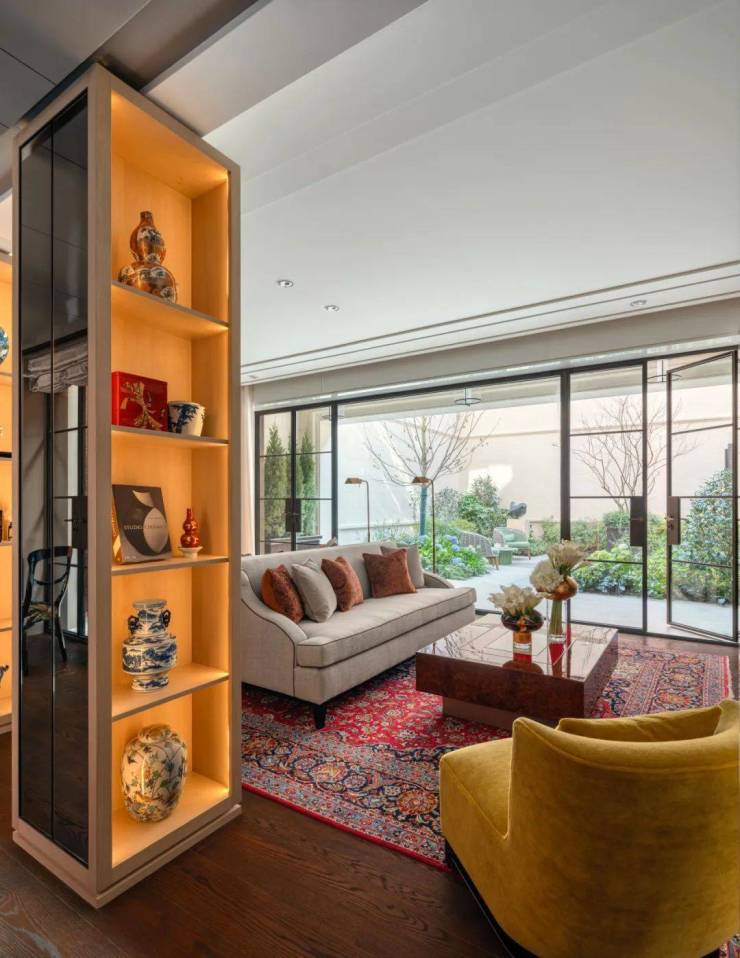 在客厅中,两个展示架巧妙地将空间分隔成主客厅区和休闲室,营造出一个与建筑尺度交相辉映的层次空间。