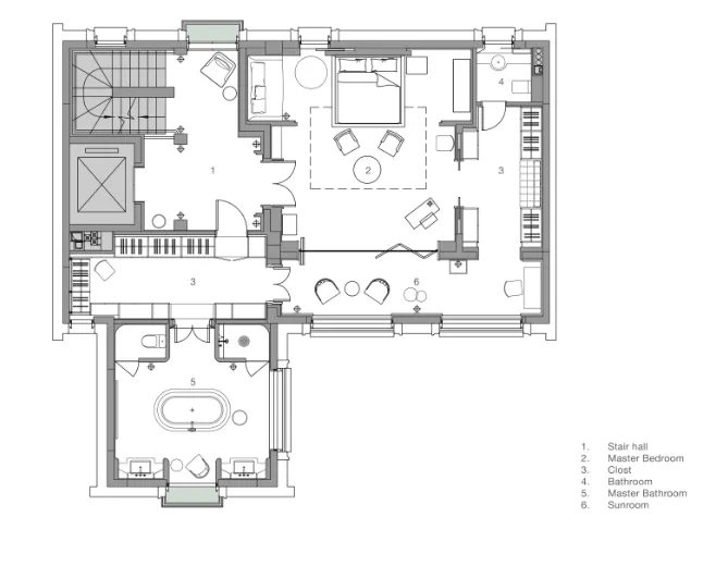 整个三层都属于主卧套间。我们非常重视这一层空间的秩序感和流线,并尝试了多种方案。最终我们没有将主卧室空间直接紧贴面向庭院的窗户,而是借鉴上海老洋房的做法,在中间增加了一个过渡空间——‘阳光房’。