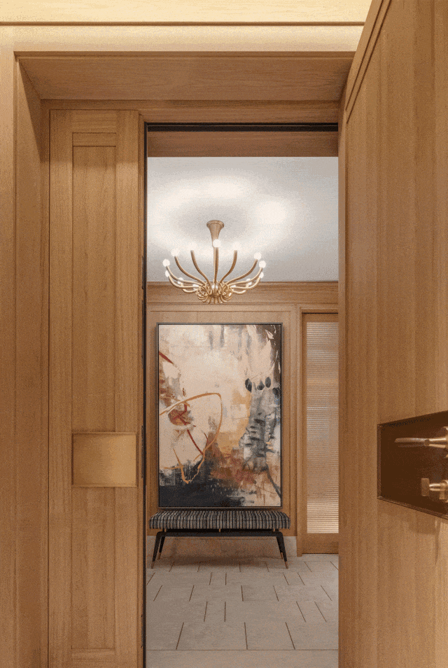 入户空间由一个简约的门厅和楼梯厅组成,门厅配有控制台和嵌入式衣柜。以多功能圆桌为中心的楼梯厅连接着楼梯、电梯、客用卫生间和客厅。空间采用白色洞石搭配特制染色的胡桃木,其浅色调与洞石和谐呼应,同时保留了胡桃木独特的纹理特征。
