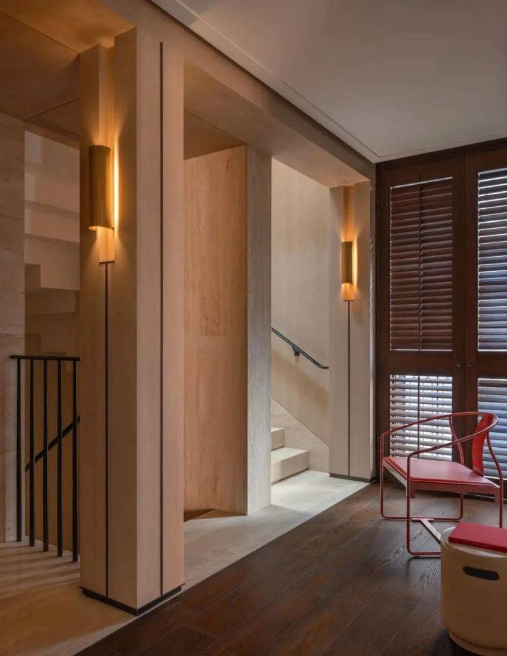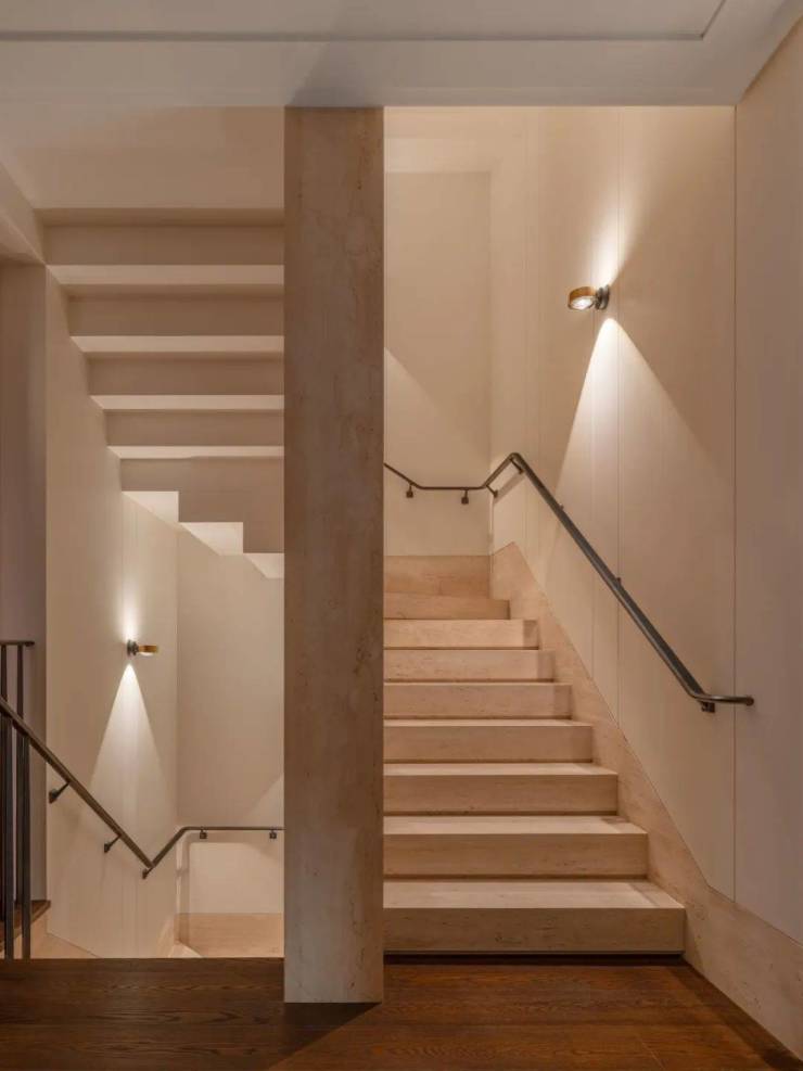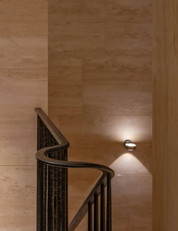 深铜色的栏杆和扶手融合传统与现代语汇,演变出一种当代型态,与现代白色洞石相映成趣,营造出优雅纯粹的意境。