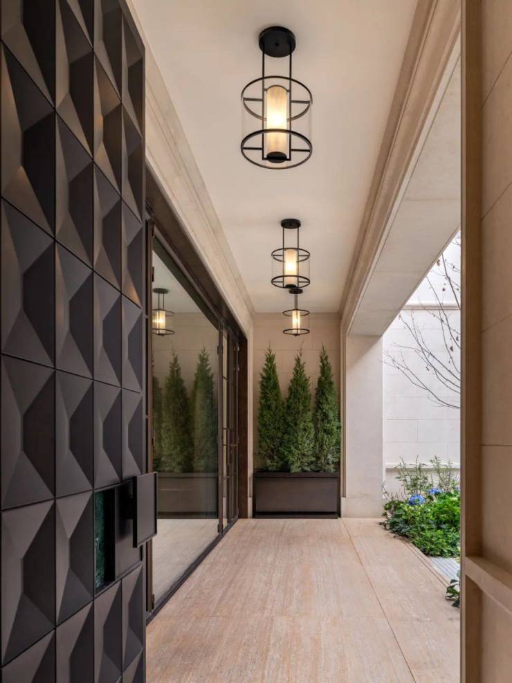 从庭院地面层,可以看到客厅和餐厅的内部空间。客厅在立面上向内凹陷,形成了一条有遮盖的走廊,通向房屋定制的深铜色入户大门。