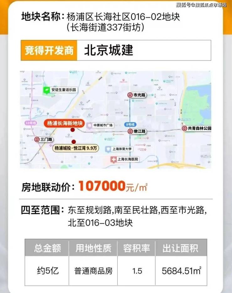 2022年7月25日,杨浦城投以20.8816亿元竞得杨浦区长海社区025-07地块(长海路街道332街坊),溢价率0%,成交楼板价50200元/㎡,地块房地联动价99000元/㎡。