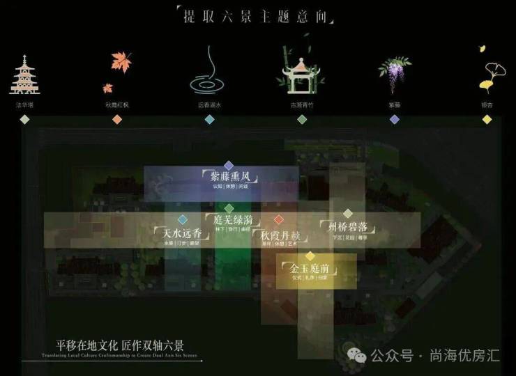 建筑们围合出的中心花园中,州桥老街、秋霞圃、远香湖、古猗园、紫藤园、银杏古树等嘉定6景被南山地产提炼、转译,形成了具有在地文化特色的6大景观主题空间。