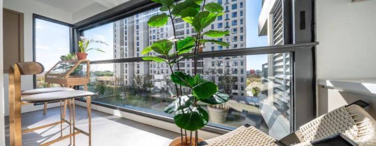阳台上,约7米电动窗缓缓升起,将室外的美景与室内的生活无缝连接。这种电动窗的设计不仅提供了便利,而且增强了居住的舒适度。电动窗的材质和性能参数保证了其耐用性和安全性,同时也能够抵御恶劣天气的影响。