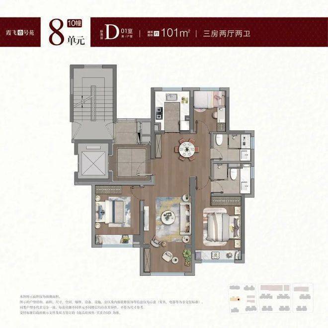 建面约100-101㎡户型,拥类独立电梯厅,无连廊+飞机户型南北通透。