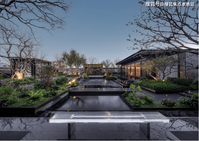 又比如,项目延续了张园“引水入园”的理念,将长200m近1000m²的水系覆盖到整个社区内。水景形态各异,有中心静水、三层跌水、点状涌泉、立面叠瀑、弧形流水五大不同呈现方式。水系的引入,让整个社区彻底灵动飘逸了起来。
