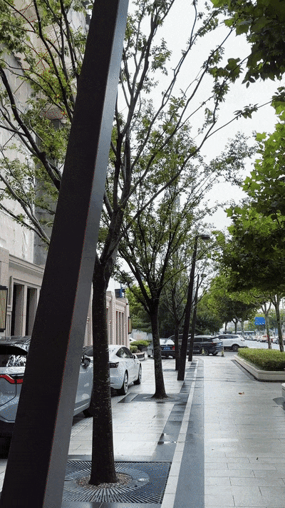 但宝华,仍然保持着这一传统,精心铺排的人行道路面,甚至,将售楼处门口的装修,覆盖到了人行道上的路灯上。紫铜打造的路灯,几乎与周边树木融为一体。