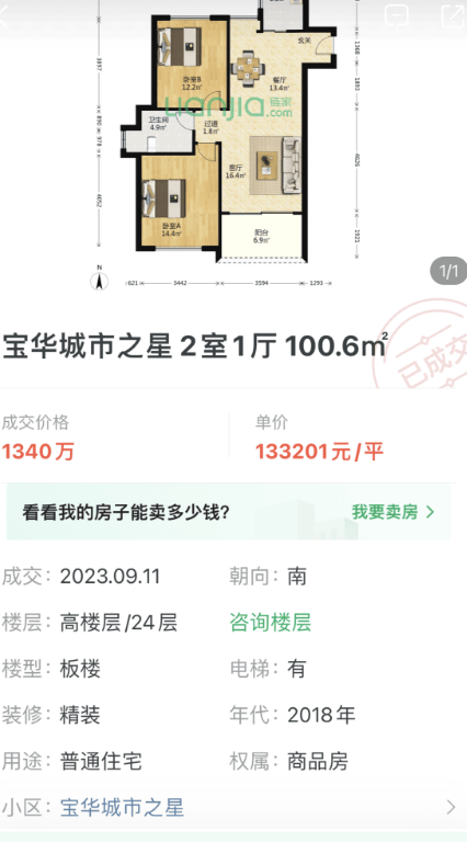 但是,现在在二手房市场,宝华城市之星,一枝独秀,某绿皮网站显示,项目在今年9月11日就成交了一套100㎡房源,成交单价高达13.3万!