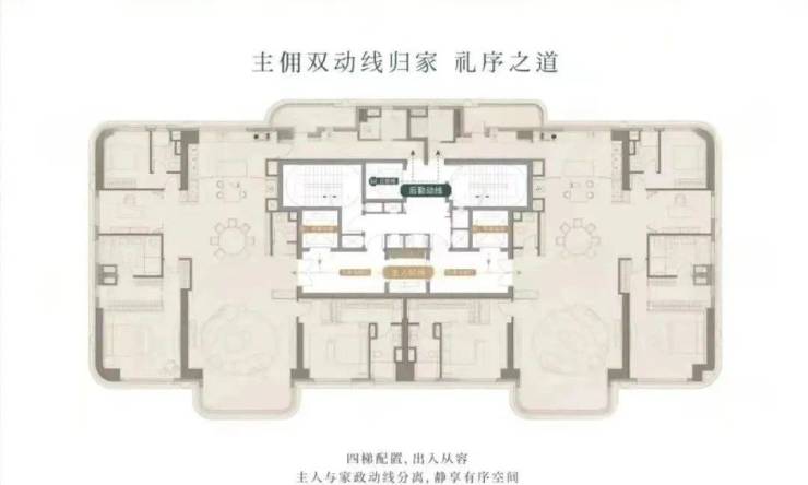当然,为了最大程度保证居住的私密性,以及进一步提升超高层的电梯运输效率,金陵华庭在一期基础上再次升级,设置了三客梯+一后勤梯的形式,将主人与家政动线分离,隐私性与尊崇感拉满。