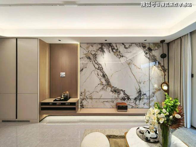 客厅、主卧采用了漂亮的圆弧形吊顶,客厅的岩板背景墙非常吸睛,整体品质感很强。