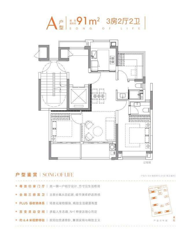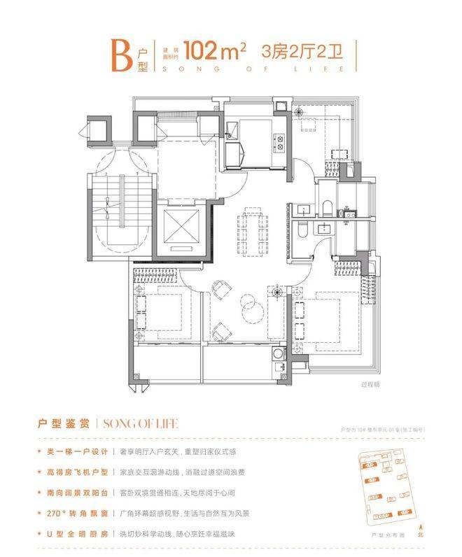 建面约102㎡三房两卫则主打“舒适升级”