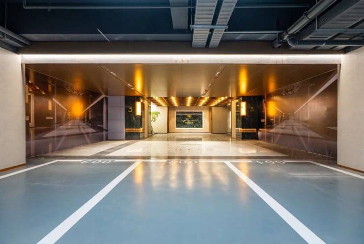 在昌平云岸,归家的尊崇始于车轮触地的第一刻,这里的地下空间早已超越功能本身,化作一场精心编排的感官仪式。当座驾滑入由石材铺就的坡道,星空穹顶便以流动的光晕温柔相迎,香槟金色的艺术线条在视线尽头舒展,如同为每位归家业主铺就的隐形红毯。