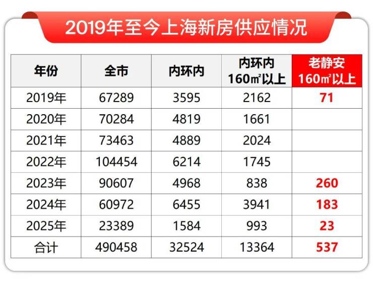 据数据统计,2019年至今全上海合计供应新房约49万套, 内环内建面约160㎡以上大户型只有1.3万 套。 其中属于老静安的大户型居然只 有537 套,占比总池子约千分之一!