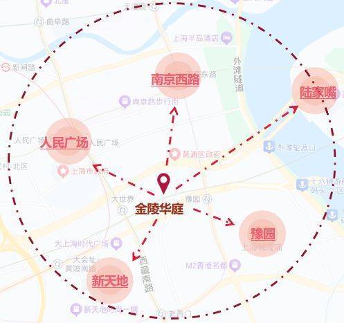 2公里内括淮海路、新天地、人民广场、外滩、陆家嘴等城市级CBD。