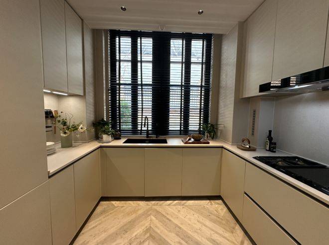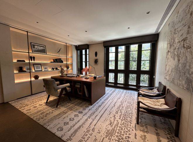 整体一层空间的东南方向,样板间设计为了茶室,配合西向落地玻璃窗,同样正对庭院。☑️弘安里售楼处电话:400-8787-740↔️