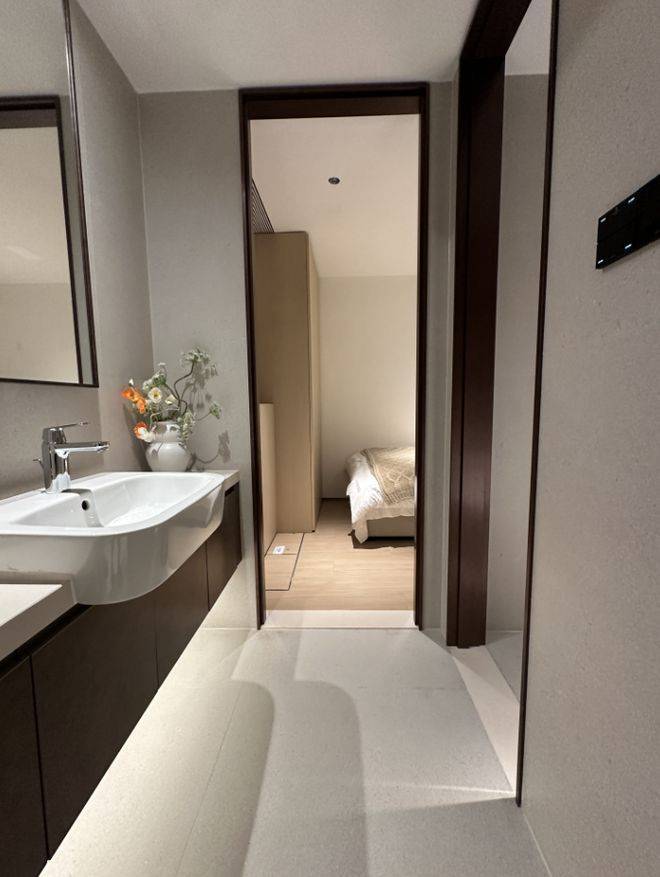 ☑️弘安里售楼处电话:400-8787-740↔️靠户型东侧,样板间设计了一个独立衣帽间和主卧套房的第二个卫浴空间。