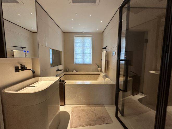 ☑️弘安里售楼处电话:400-8787-740↔️而样板间里这第二个卫浴空间,更接近于享受级。嵌入式浴缸,设计了魔镜系统,可以供业主泡澡时观影娱乐;除此之外,这个卫生间也有独立的淋浴房,并设计有桑拿房。☑️弘安里售楼处电话:400-8787-740↔️