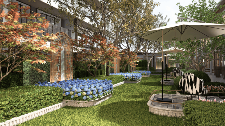 海派生活轴的端点是邻里交互的艺术花园,是业主茶余饭后散步的好去处。