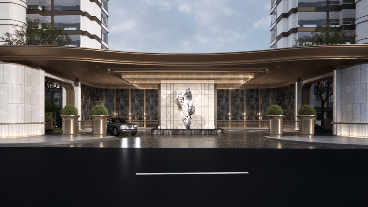 挑高金属雨棚采用极细边,中间凿壁采用透光奢石,搭配极具现代主义的雕塑彰显小区档次,背景墙面采用维多利亚黑大理石,奢华且低调。