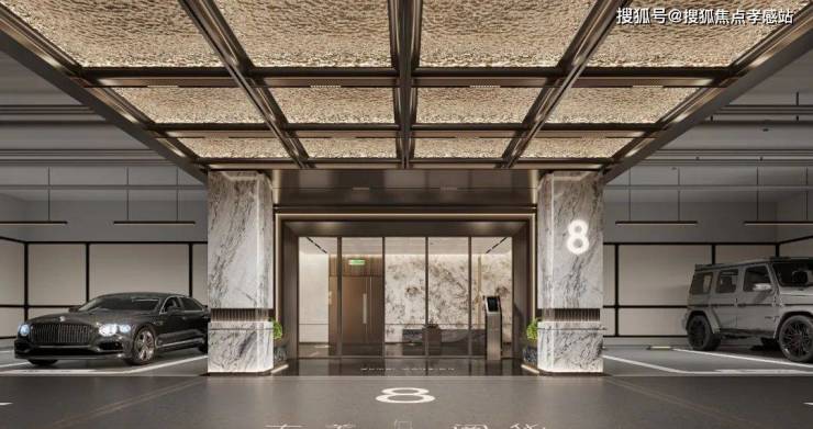 高定地下入户大堂,延续首层入户大堂材质高标,精选雪山银狐天然透光奢石,营造精奢生活质感。