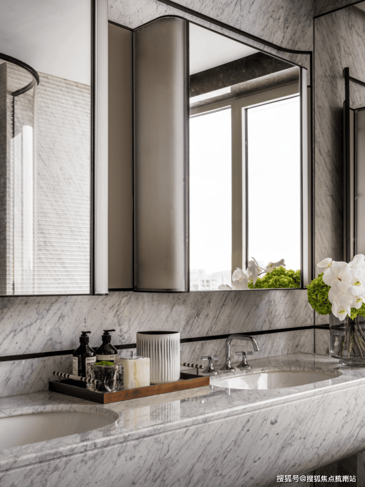 细边框不锈钢门套以极简线条勾勒出精致轮廓,诠释低调奢华的质感。大面积岩板铺陈地面,以极致纹理与沉稳色调,奠定空间的奢华基调。