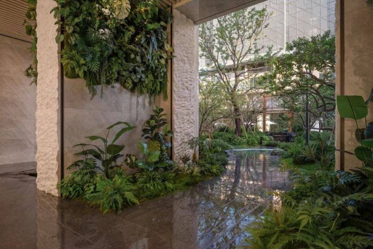 藤蔓沿墙垂落,水流自然流入,花草在架空层间摇曳生姿,使这一开放场域成为生机盎然的灵动空间。