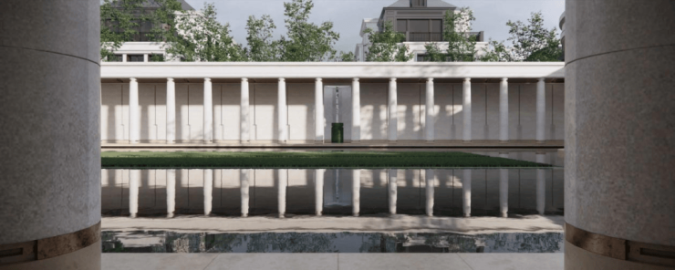 社区南门:约36米奢阔尺度,传承自凡尔赛宫的三泉林,对称仪制带来尊崇感,同时确保归家时人车分流,在保证安全的前提下,更带来从城市回归家园的心境转换。