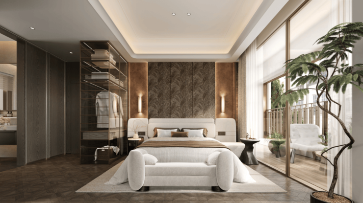 主卧建面约25㎡,自成一方小天地。除了设计有干湿分离的卫浴空间,还特别打造了步入式衣帽间,满足主人的“收藏欲”;加之南北通透的布局,连接双联阳台,阳光浸润生活,清风鲜活呼吸。