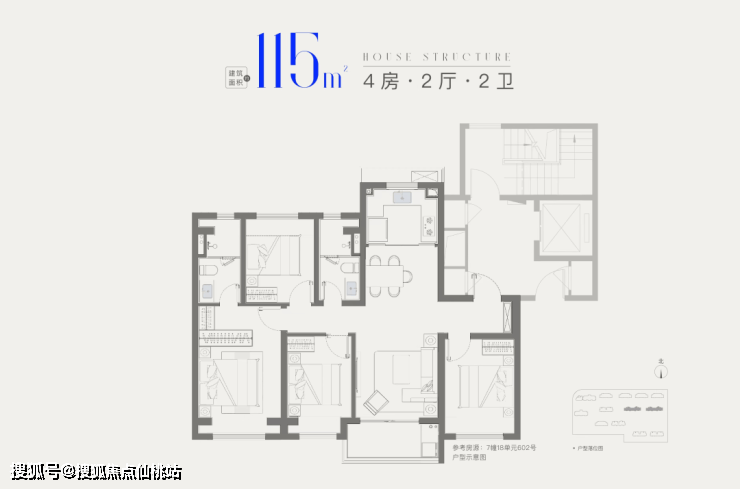 建面约115㎡4房2厅2卫,做到了四开间朝南+全卧室带飘窗+主卧套房设计,一步到位的大四房户型。兼顾大4房的功能性和空间尺度,非常难得,更适合四口之家或三代同堂家庭居住。