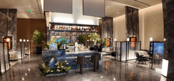建筑立面也不存在效果图代替,大比例石材,搭配大面积玻璃与金属线条,现场看很有高级感。