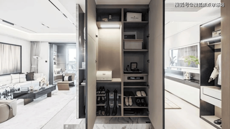 入户后,所有玄关柜都是交付标准,还特别配备了“除臭精灵”,下方预留了扫地机器人的空间,为日常生活带来便利;项目采用了大金品牌的中央空调地暖两联供系统,以及格兰斯柯的新风系统。