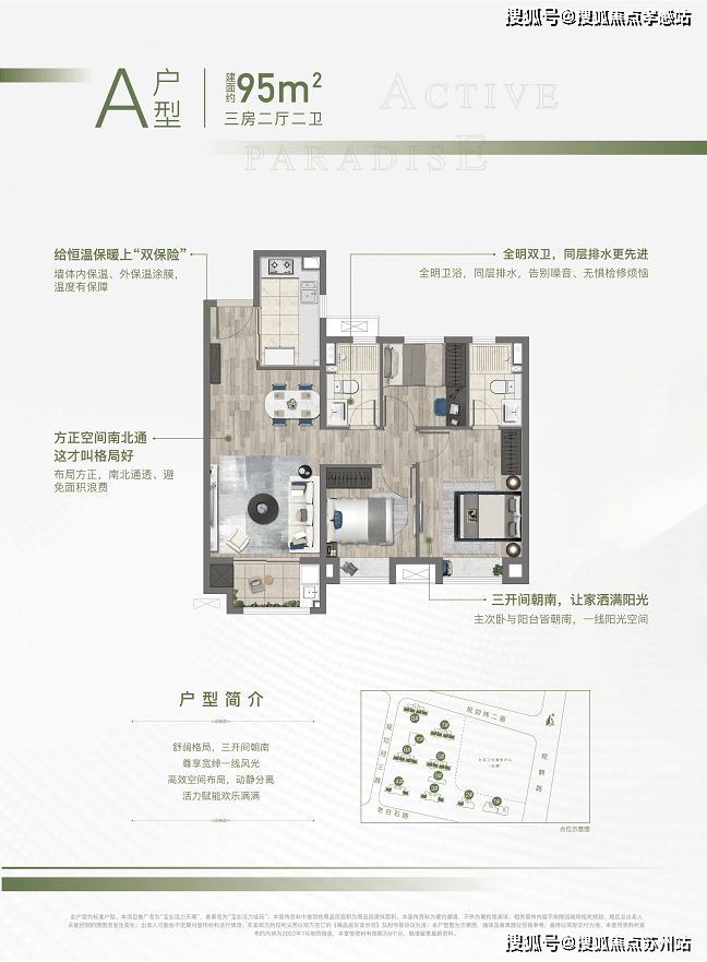 1、约95㎡的三房,南北通透,全明设计,三开间朝南,户型方正。