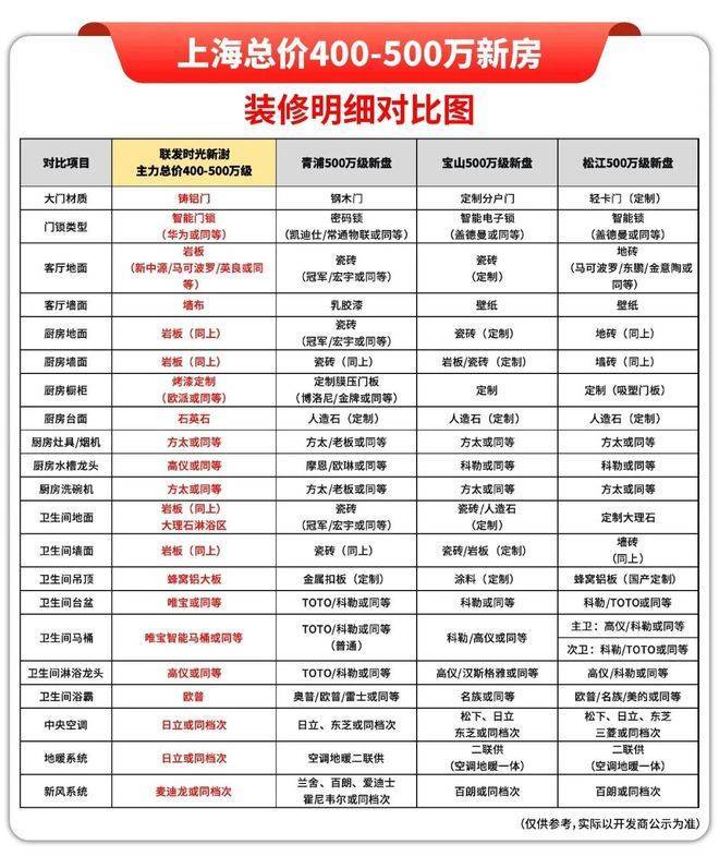 我把各区目前四百万比较热门的新房的装修标准做了横向对比: