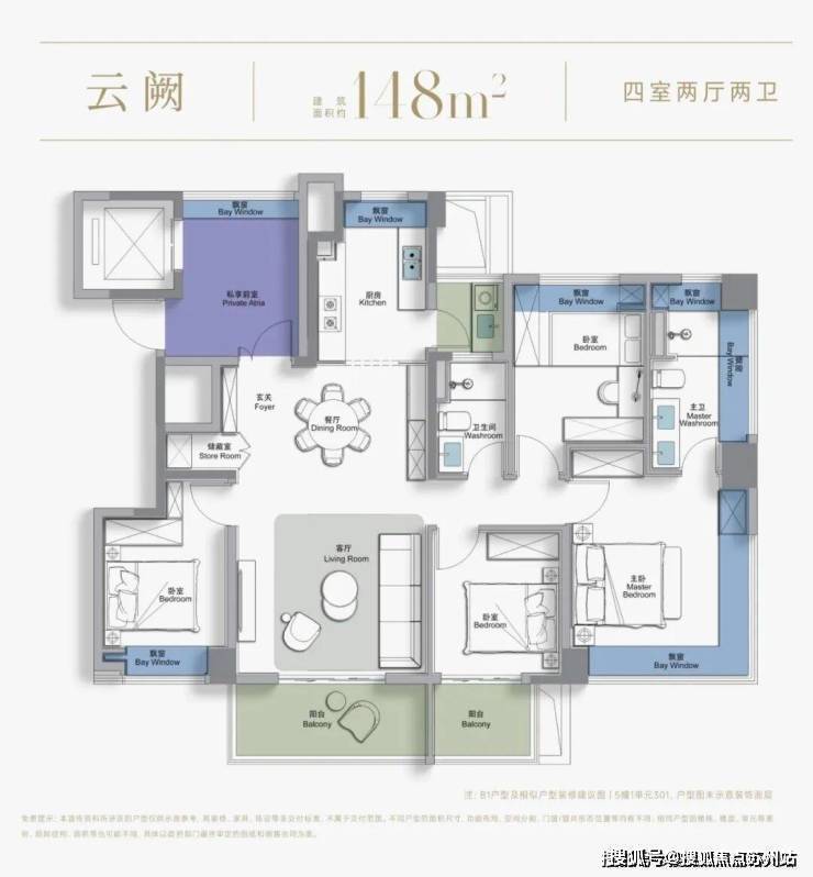 作为改善旗舰户型,建面约148㎡以四房两厅两卫格局,实现四开间朝南极致采光。一梯一户配置打造私享阳光梯厅,兼具收纳与私密。餐客采用LDKB一体化设计,作为“好房子”新规后首发户型,拥有约3.05米层高更显开阔。主卧配备270°环景飘窗(仅5#、10#楼边套),无敌视野,晨起赏朝阳、夜晚观繁星;独立衣帽间与全明双台盆主卫,尽显品质格调。