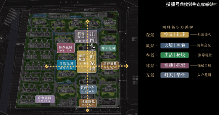 以江南人文精神为源点,打造两轴一环五进空间,江南礼序归家轴串联启迎盛礼、筑阙会友、归家华堂等5重礼制,尊崇归家;健康运动轴以24小时跑道为社区活力生活环,串联儿童乐园、长者康养、疗愈花园等10大生活场景,营造全龄全时的江南诗意生活