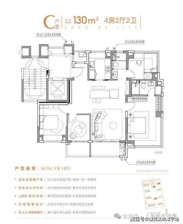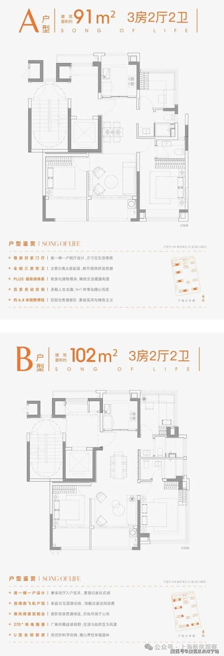 建面约99㎡3房2卫户型不仅保留三开间朝南和餐客厅一体化的优势,更在尺度上大踏步进阶。主卧面宽高达约3.7米,客厅面宽高达约3.75米,适配有尺度改善需求的客户,而市面上同面积段产品尺度基本为客厅面宽约3.5米,主卧约3.3米。