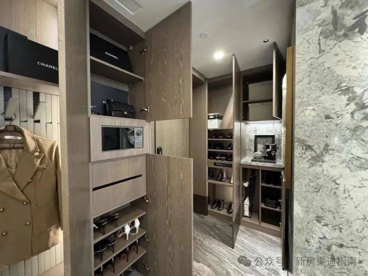 进门后玄关处左右手都有通顶玄关柜,内置鞋柜精灵,可以看到玄关内部的隔板也是高度不一,普通鞋子、高筒靴、雨伞架等等,都有分区。