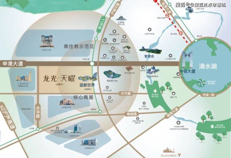 【龙光·天曜】就位于商住教示范区的门户核心位置,从上海市区自驾来临港,经S2沪芦高速(已全程免费)下闸道进入申港大道,首先映入眼帘的就会是滴水湖首个天际坐标——龙光蓝鲸世界百米酒店。这个酒店也是【龙光天曜】建面约50万方综合住区的商业配套部分。
