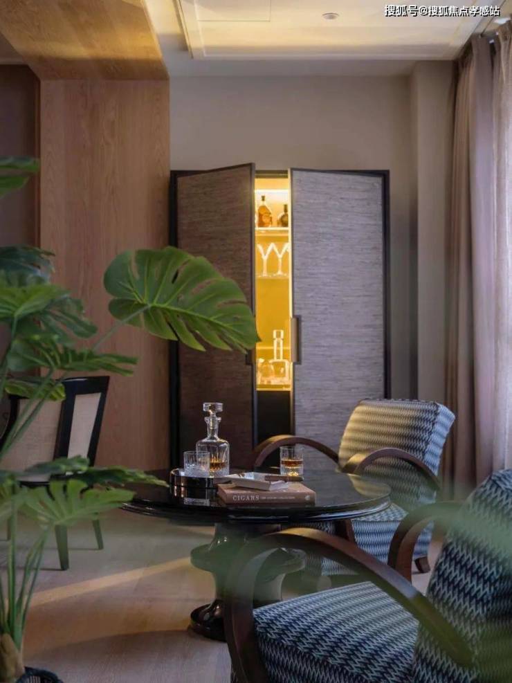 客厅另一端,是连接房内与外景的介质空间,在这里主人和客人可以享受美酒雪茄。看似独立的空间,实际延伸了客厅的功能,也延伸了窗外景观到室内的视线。