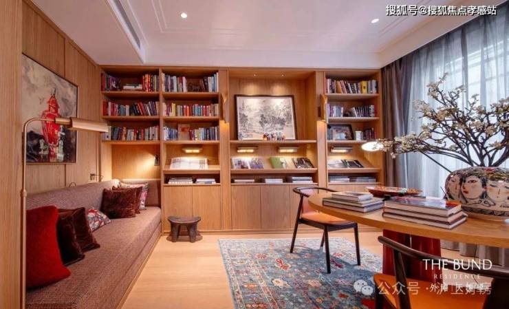 多功能书架彰显着设计的巧思,形成有如博物馆般的展示方式,即可放置日常读物,亦可展示珍本藏书。同时,利用屏风做隔断,与圆桌结合形成私密空间。
