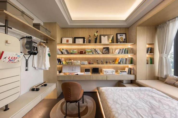 其中主卧的270°转角飘窗就有约5.7m²,通过与外立面的结合,直接做了梳妆台和储物柜,拓展了飘窗的实用性。